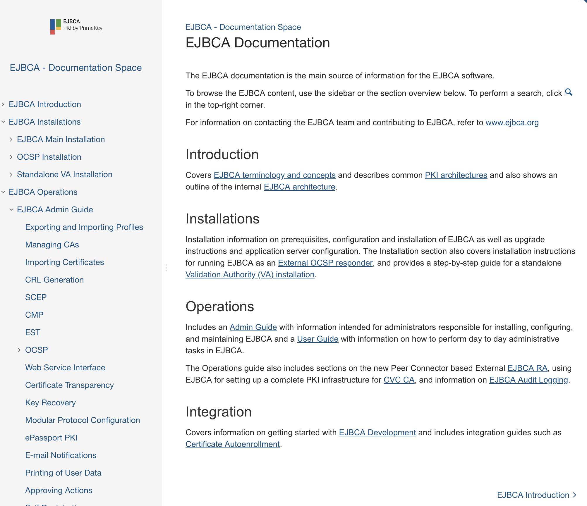 Naturally, this is just a first step towards a far more organized, updated and user friendly documentation. You may notice a sense of chaos and disarray in the current structure, and while we agree with you fully, that is merely a consequence of the already existent structure coming to light. Major changes to take notice to that the Release Notes (this document), Change Log and Upgrade Notes have all been moved in here as well. They're still available offline from within the doc folder in the release zip, but are now also published both online and deployed with EJBCA to the application server.