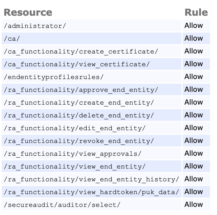 EJBCA Access Rules inherit the state from their parent rule by default, unless individually specified. Each access rule consists of the states Allow, Deny and Inherit.