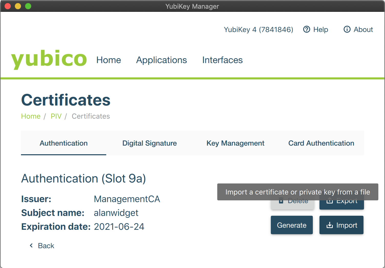 - The certificate details are displayed on the Authentication tab and YubiKey is now up and running.