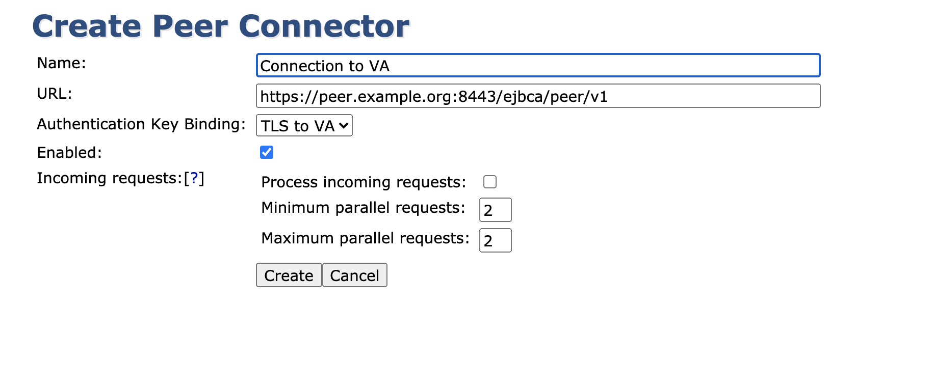 - Name the connector as desired, configure the URL to the downstream node and make sure that the correct Authentication Key Binding is selected. If this connector is going to serve an RA, select Process incoming requests (for a VA you may leave it disabled).