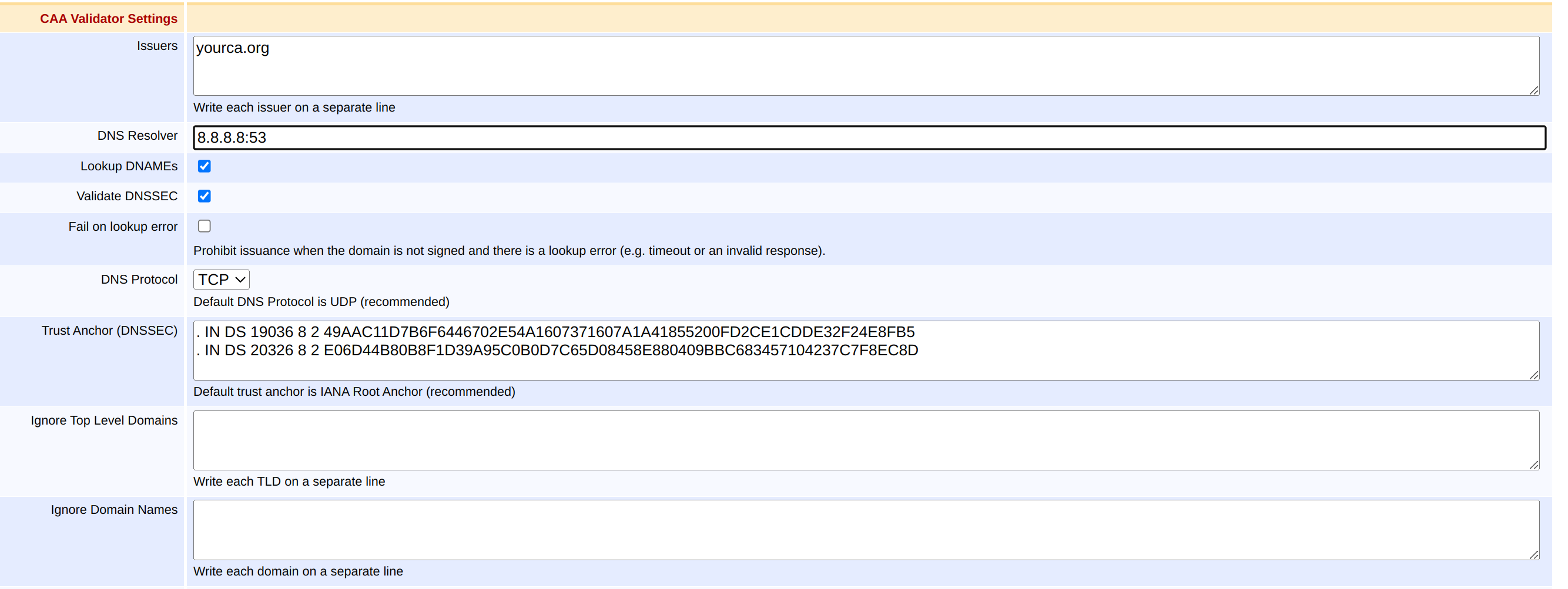 Ignore Top Level Domains | CAA records are seldom put on TLD level, and looking up CAA records for the TLD can waste milliseconds. With this setting, you can specify a newline-separated list of top-level domains for which no CAA lookups will be performed. For example: CAA lookups will still be performed on subdomains, e.g. |