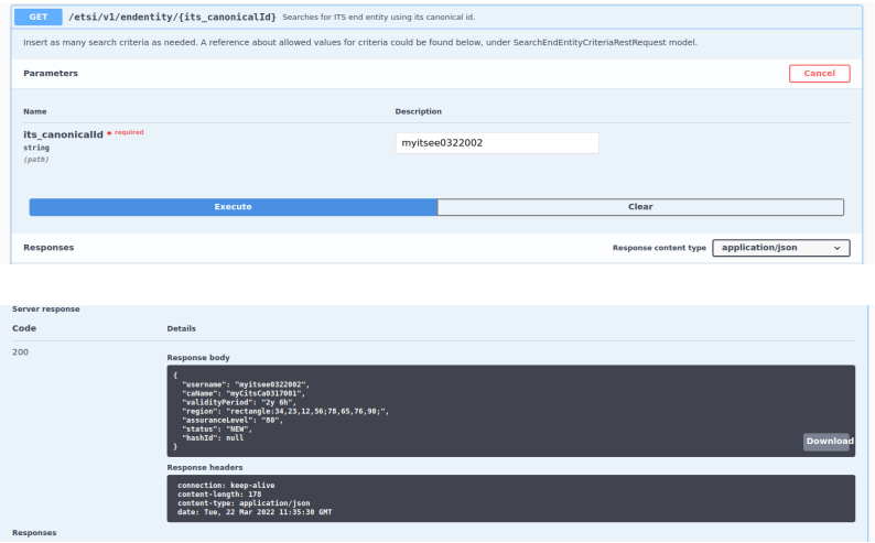- Authorization validation: https://localhost:8443/ejbca/its/etsi/v1/certificate/{ecaCertificateId}/validate