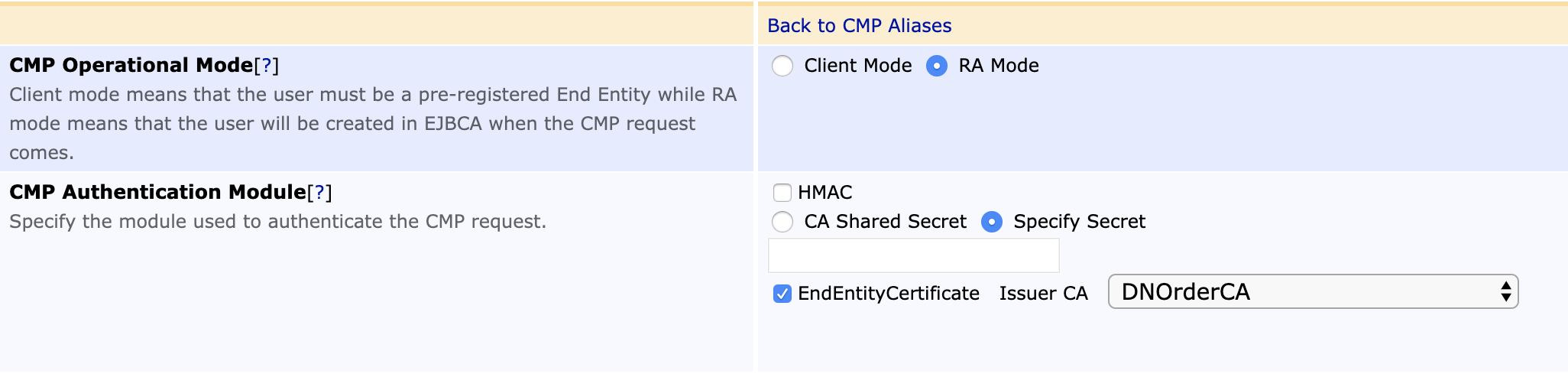 To configure EJBCA for Direct CA - Base Station Communication through an RA, click CMP Configuration under System Functions and configure a CMP Alias with the following configuration: