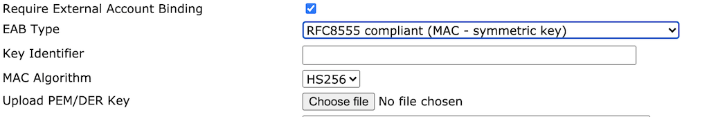 Long requested, we've implemented ACME External Account Bindings in accordance with RFC 8555 section 7.3.4. External Account Bindings allows the client to specify a unique ID number that is associated with that ACME account, and in our implementation we've associated the ID with each issued certificate for easy lookup later. In addition to being able to authenticate the ID using a MAC as per the RFC, we've also allowed for using a signature from a locally issued certificate instead.