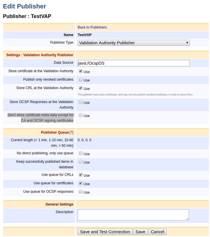 Two types of publishers support publishing of OCSP responses, the Validation Authority Peer Publisher and the Validation Authority Publisher.