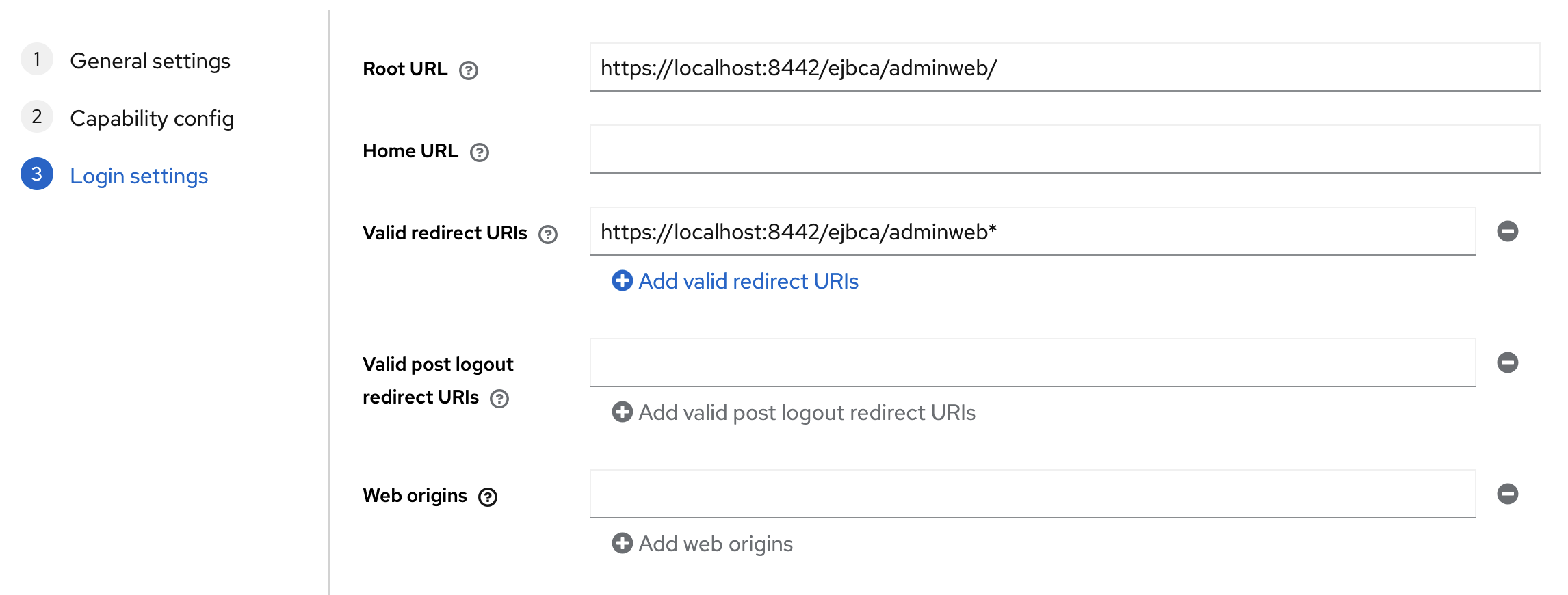 Set Valid Redirect URIs to https://localhost:8442/ejbca/adminweb*