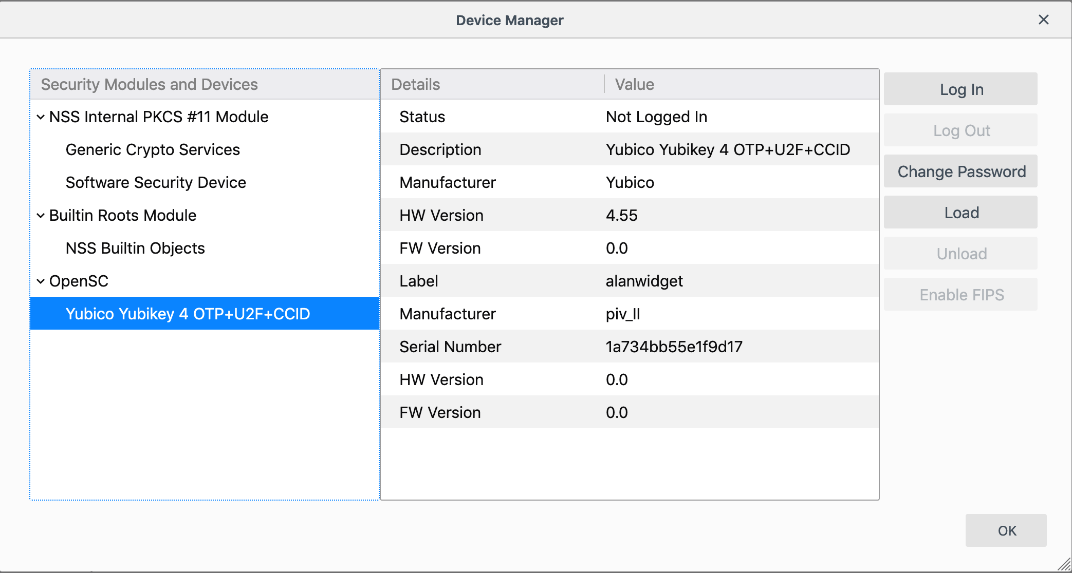 - Verify that YubiKey is shown as a new security module and click OK to close the Device Manager.