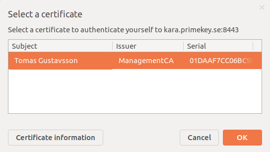 CODEmodutil -dbdir sql:$HOME/.pki/nssdb/ -list- Open EJBCA Admin UI in Chrome and enter your PIN when prompted.