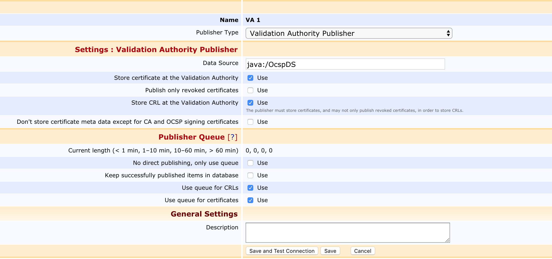 | Data Source | The database of the standalone VA where this publisher will publish certificates. Use java:/OcspDS if ocsp-datasource.jndi-name=OcspDS. This must be a non-tx/jta=false data source. |