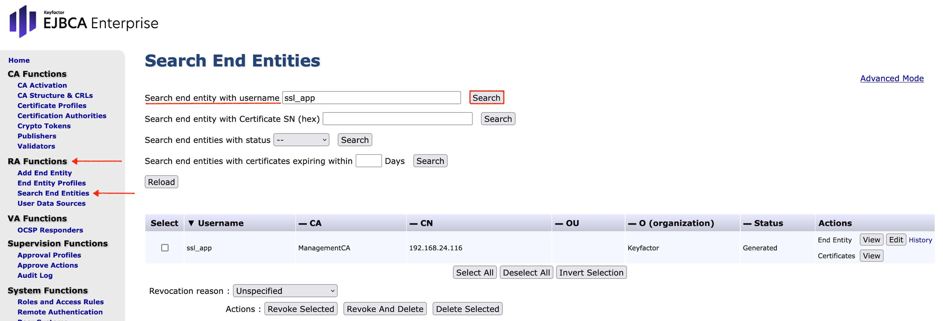 - In the EJBCA Enterprise, search RA Functions in the side menu and click Search End Entities.