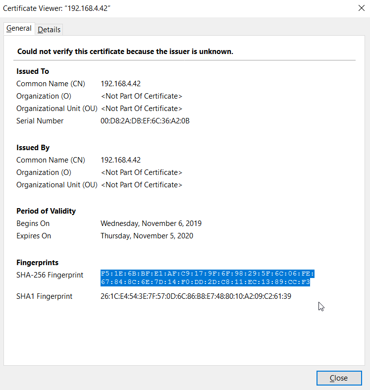 In the Certificate Viewer, find the SHA256 Fingerprint and compare it to what was shown on the appliance's display.