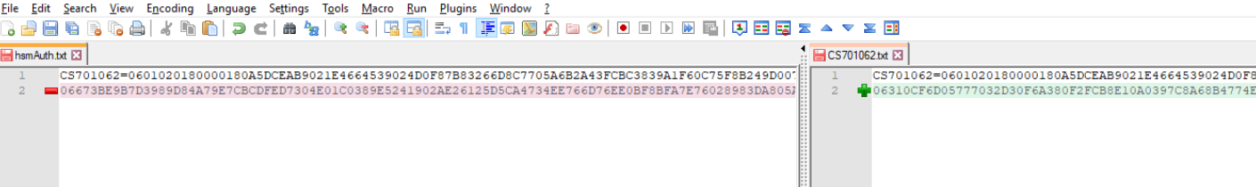 Go the tab with the HSM Auth Key and split the key in two lines. After the following steps, Line 1 contains the first 828 characters that should match, Line 2 contains the rest of the key: