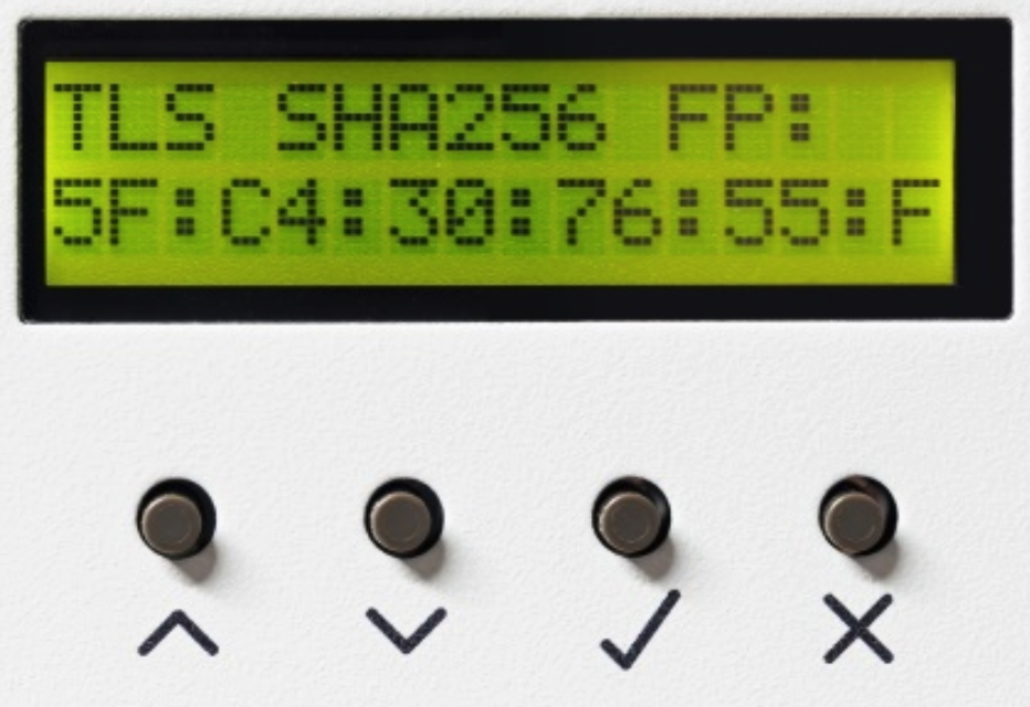 When boot-up is complete, the TLS Fingerprint is displayed in the front display. Write it down, you will need it for a later step: