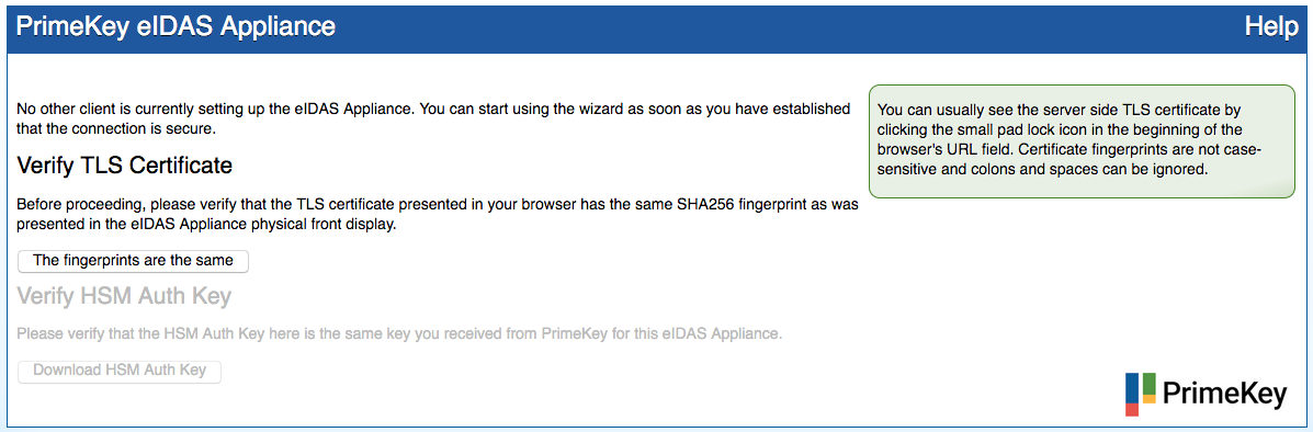 Click The fingerprints are the same in the Hardware Appliance Configuration page. You will be asked to compare the HSM Auth Key with the key you received via e-mail: