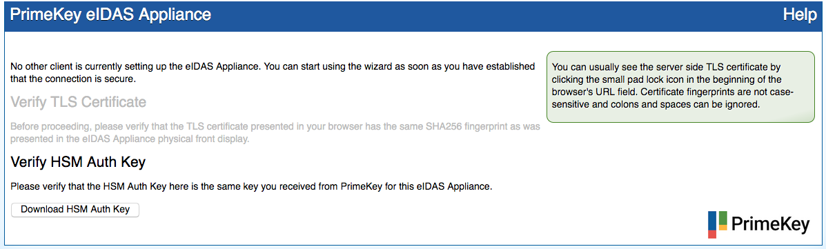 Do not continue to use the machine if there is a mismatch between the HSM Auth Key and the key you have received via e-mail. In such a case contact the PrimeKey support team.