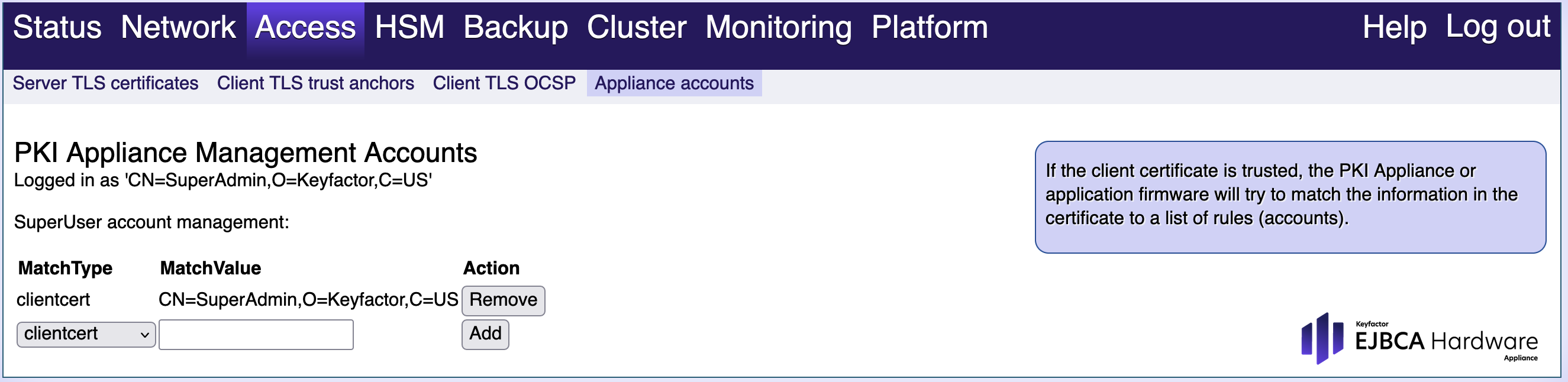 Client side TLS certificates are used to authenticate users or external systems to the Hardware Appliance. For a client certificate to even be considered by the Hardware Appliance for authentication it must be issued by a CA that is trusted by the Hardware Appliance. If the client certificate is trusted, the Hardware Appliance or application firmware will try to match the information in the certificate to a list of rules (accounts).