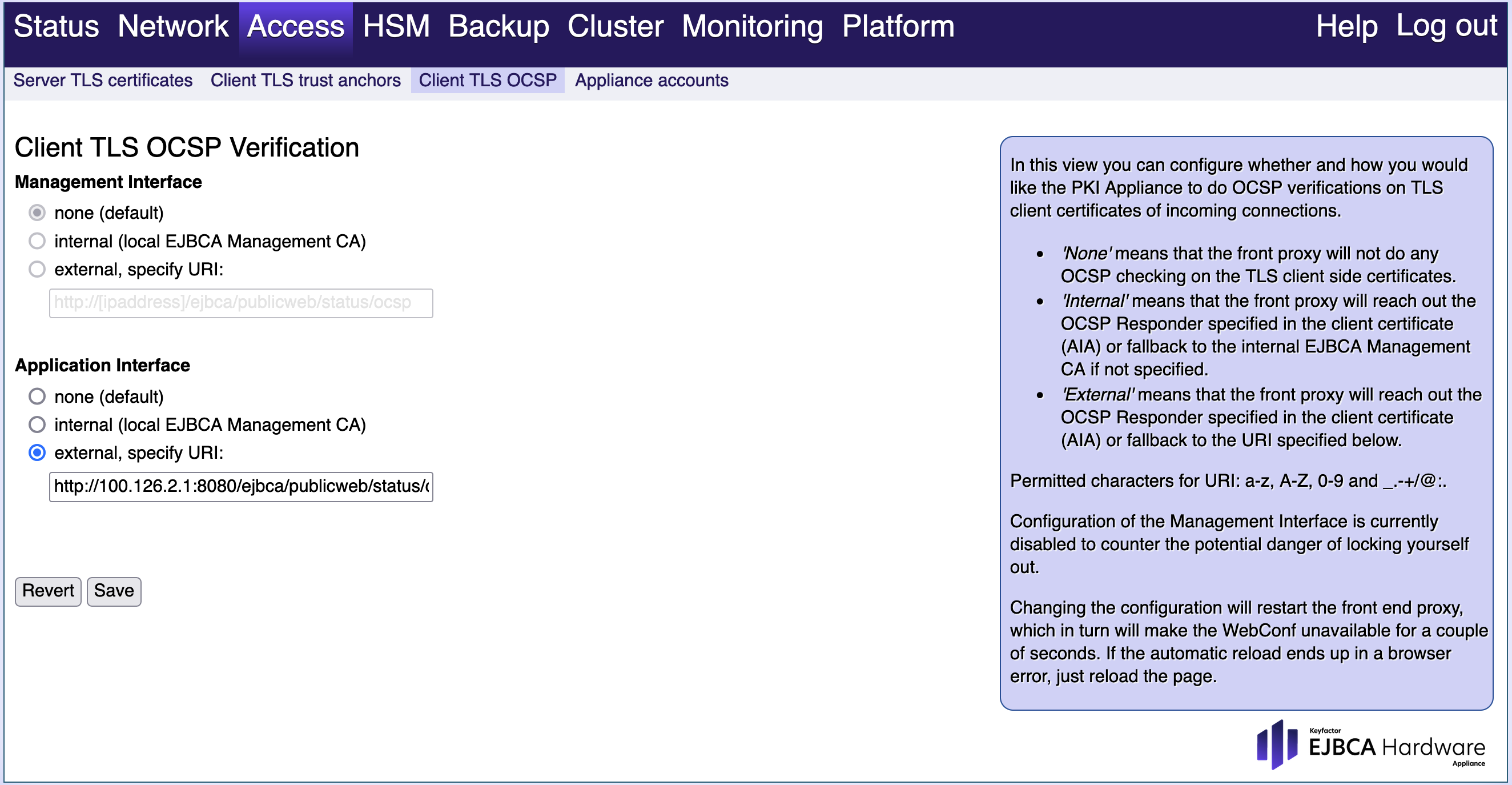 Use this tab to configure whether and how the Hardware Appliance performs OCSP verifications on TLS client certificates of incoming connections. Currently, the options are available for the Application interface only. The configuration for the Management interface is currently disabled. This way you avoid the risk of locking yourself out.