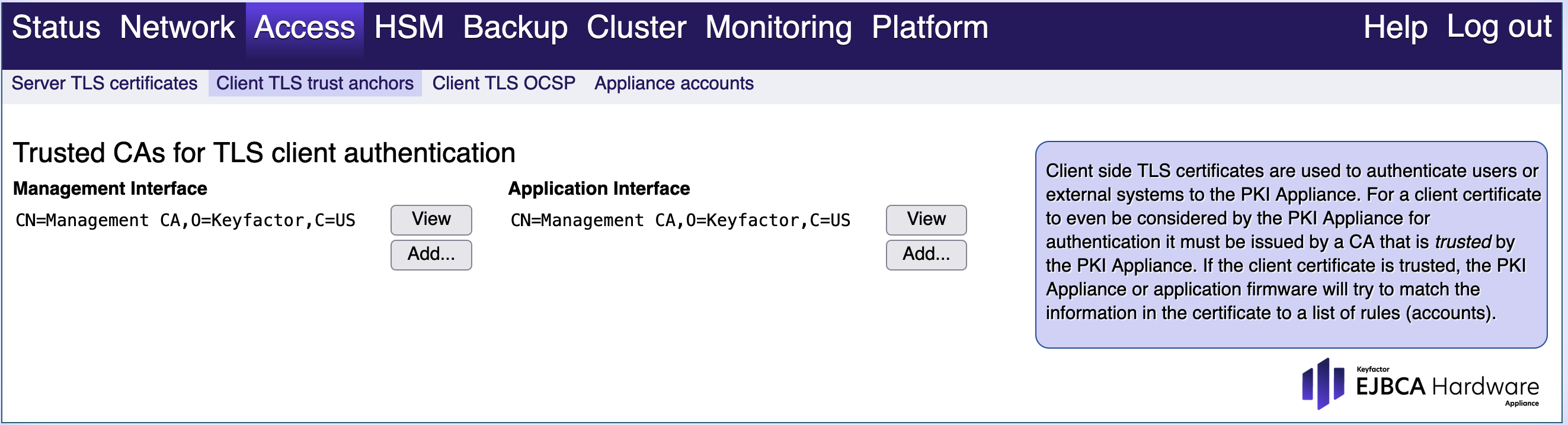 You can configure different trusted certificates (trust anchors) for each network interface. If you want to use client TLS certificates from an external CA, you need to replace the trusted certificate. To avoid locking yourself out of the Hardware Appliance, first add the appropriate matching rules in the sub tab Access > Appliance accounts, so that you can reconnect and continue to administer the Hardware Appliance after the trusted certificate is replaced.