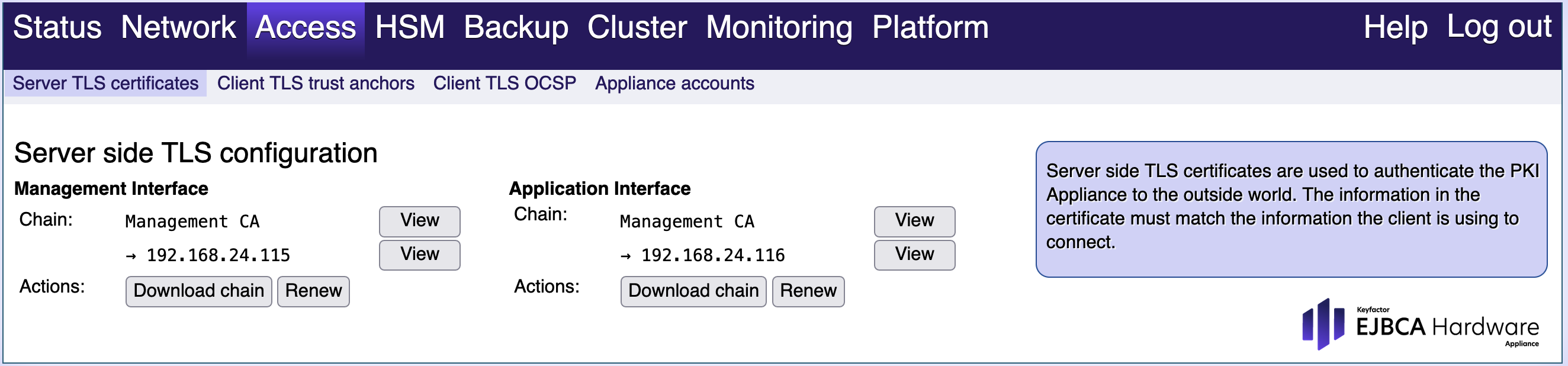 Server side TLS certificates are used to authenticate the Hardware Appliance to the outside world. The information in the certificate must match the information that the client uses for the connection. The client must trust the issuer of the certificate.