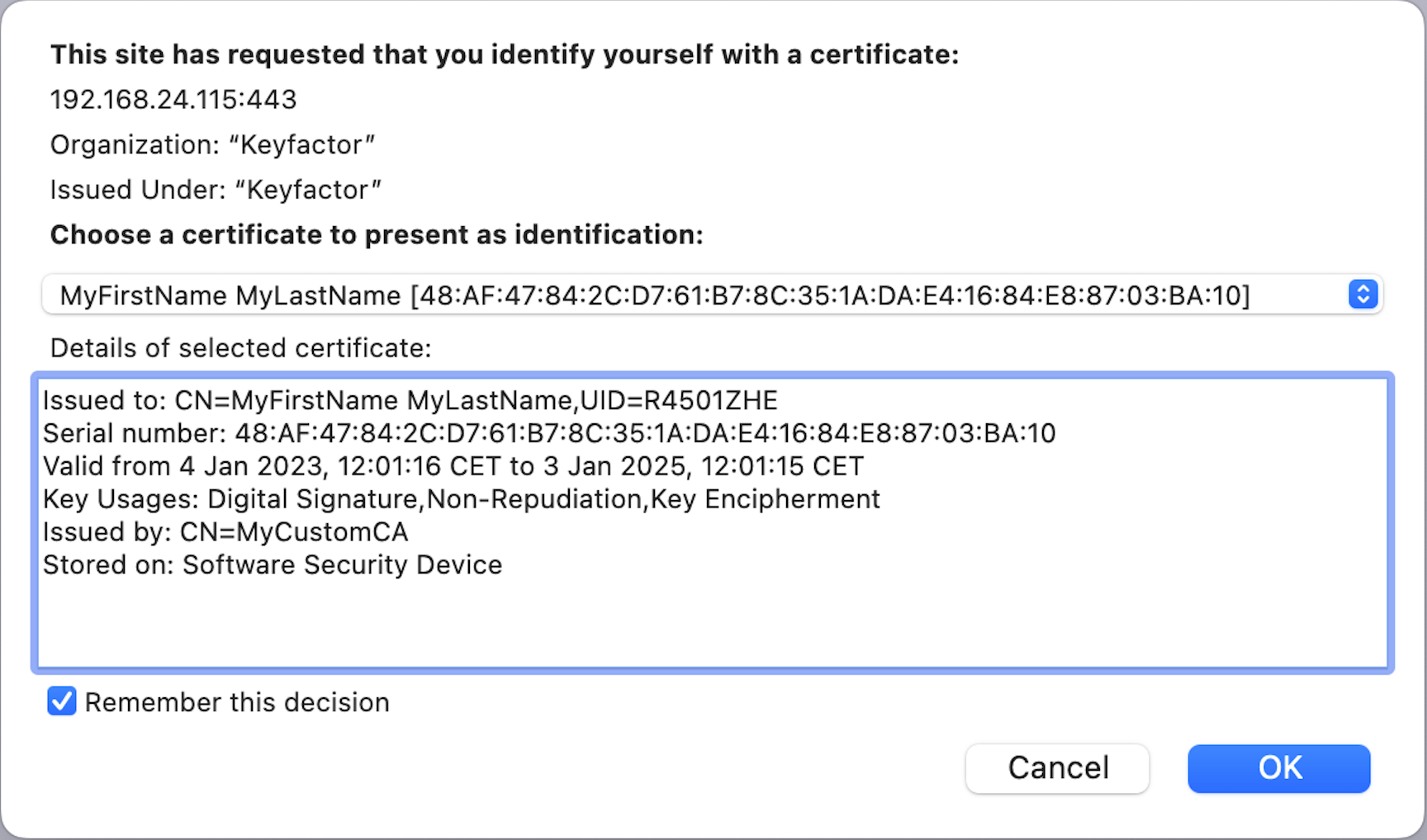 C=MyCountry,O=MyCompany,SURNAME=MyLastName,GIVENNAME=MyFirstName,serialNumber=G824734,CN=MyFirstNameMyLastName,UID=R4501ZHE