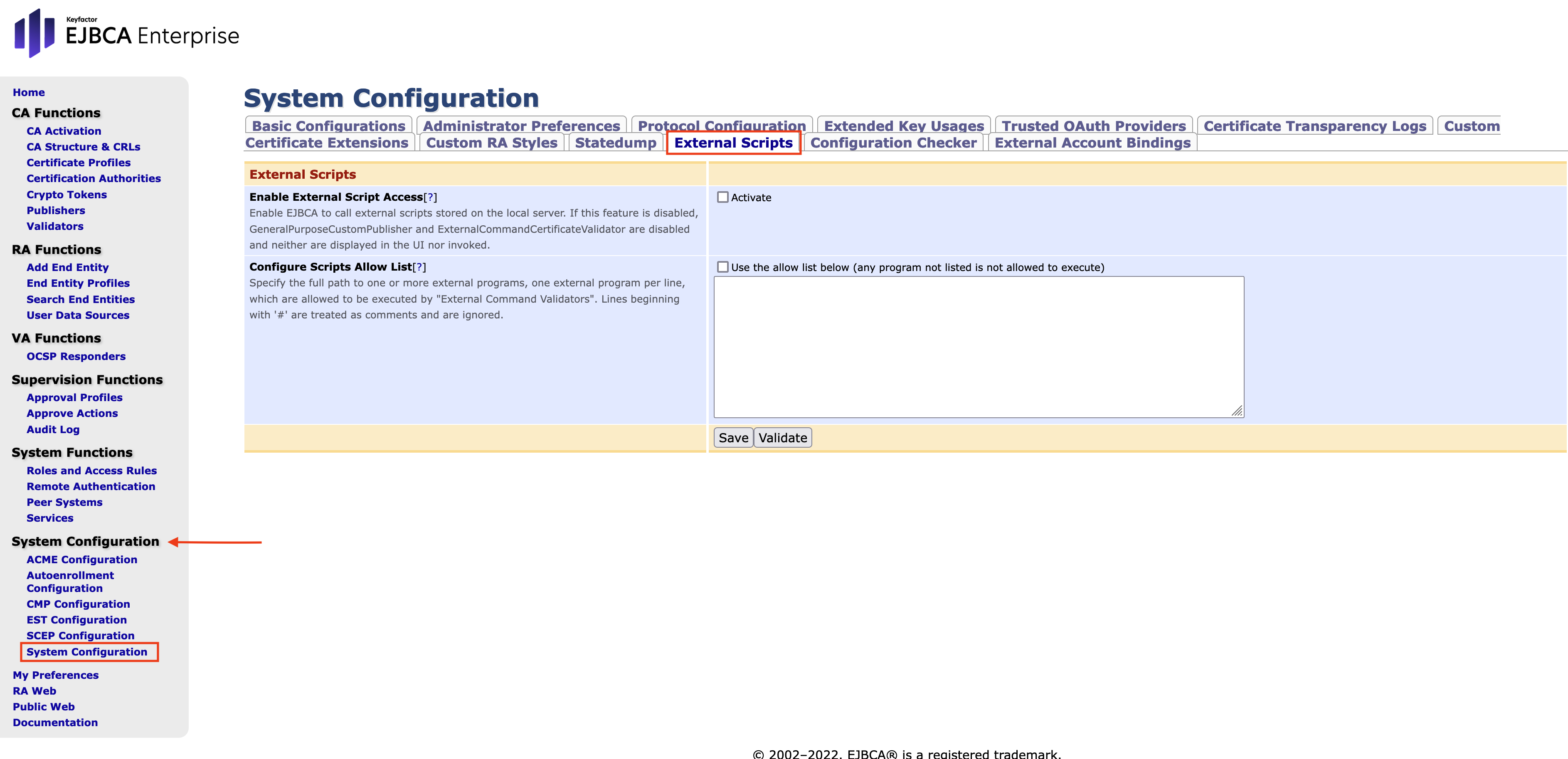 - Open the EJBCA Enterprise. In the sidebar, in the System Configuration section, select System Configuration.