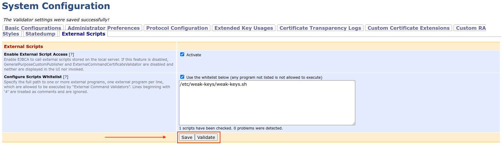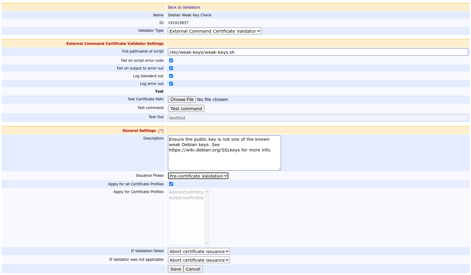 CODE17:29:16,247 INFO [org.cesecore.keys.validation.ExternalCommandCertificateValidator] (ajp--0.0.0.0-8009-4) Test external command certificate validator Debian Weak Key Check 17:29:16,295 INFO [org.cesecore.keys.validation.ExternalCommandCertificateValidator] (ajp--0.0.0.0-8009-4) Could not call external command '/etc/weak-keys/weak-keys.sh' with arguments [/tmp/org.cesecore.keys.validation.ExternalCommandCertificateValidator-1593012556248505049562192935548.tmp] sucessfully: Detected errors while running the external application /etc/weak-keys/weak-keys.sh.The message Could not call external command means that the script returned a non-zero exit status, which is the expected behavior when the certificate contains a weak Debian key.