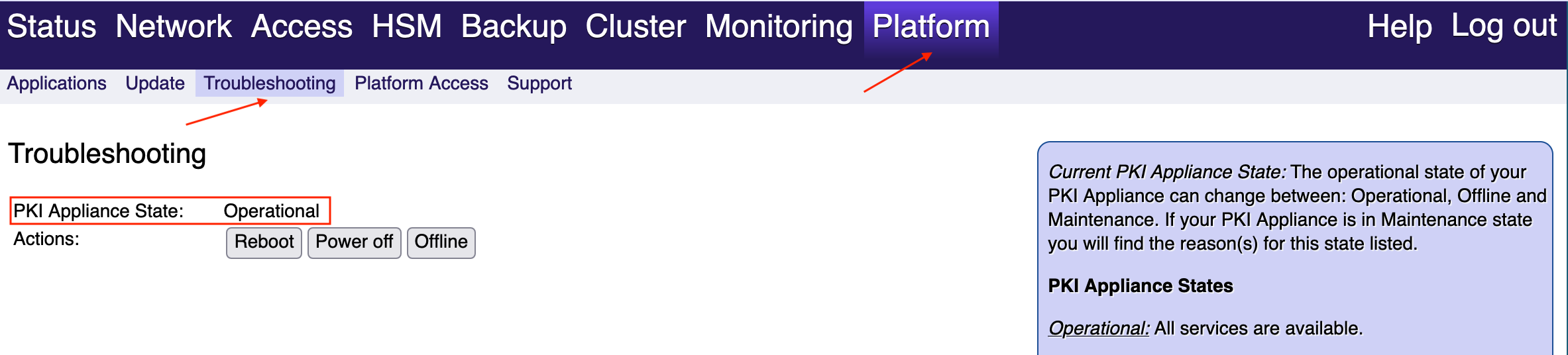 To find out the state of the Hardware Appliance, go to the page Platform > Troubleshooting in WebConf. The Hardware Appliance can be in one of three different states: