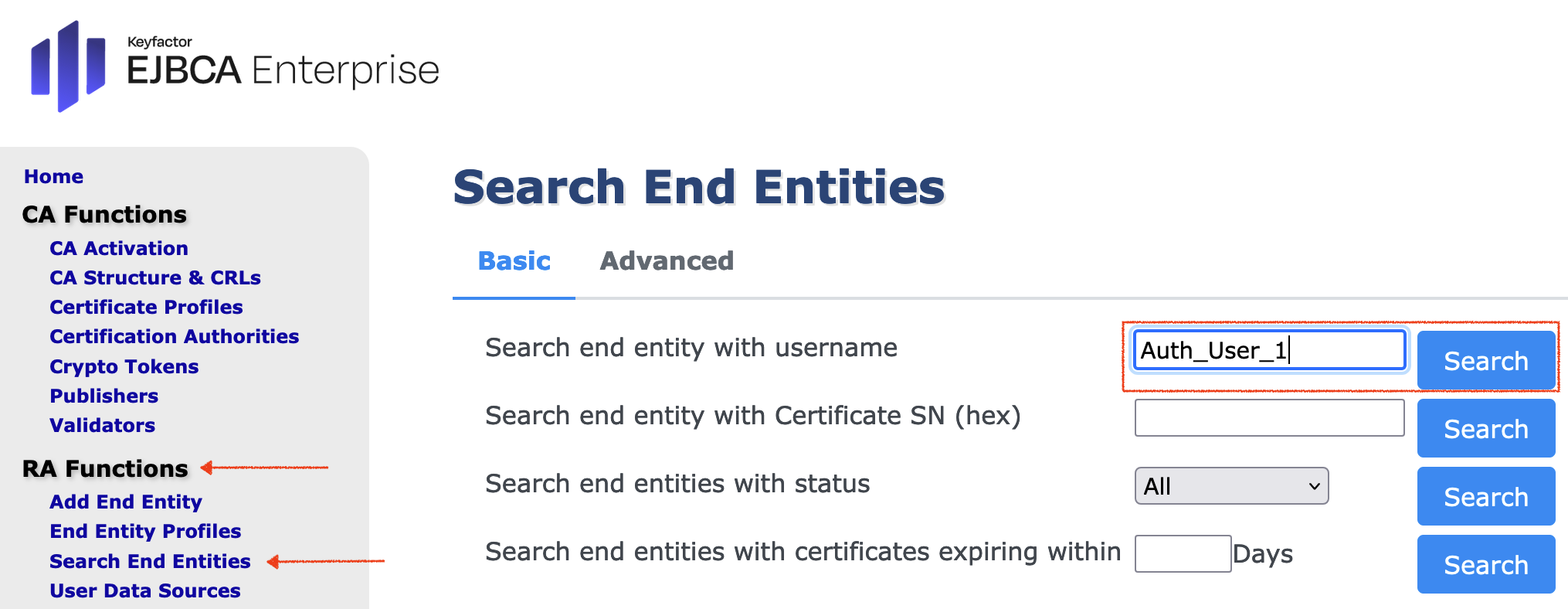Open EJBCA Enterprise. In the sidebar, in the RA Functions section, select Search End Entities.