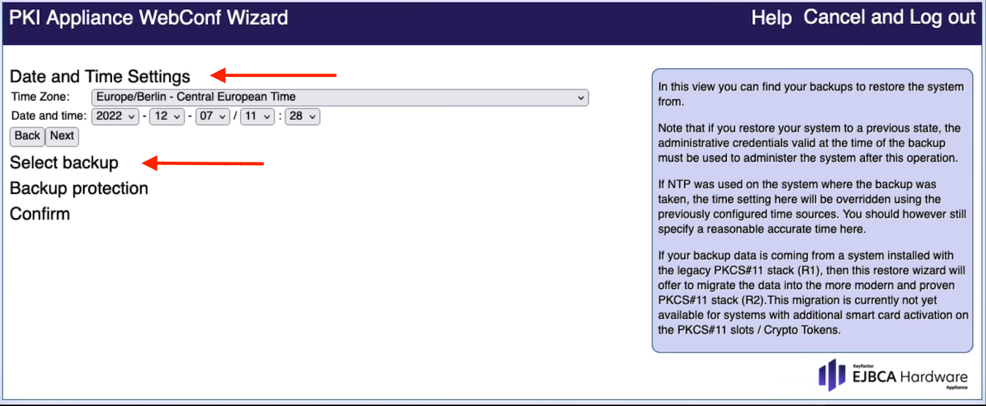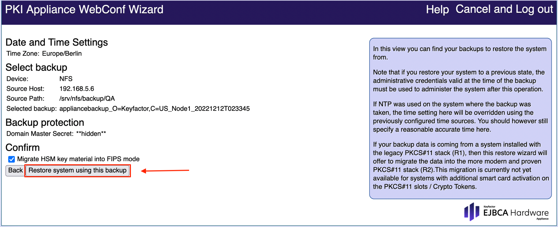 For more information refer to the section Migrating the HSM to certified FIPS (Federal Information Processing Standards) mode.Click Restore system using this backup to continue the usual Restore system from backup procedure. The actual migration is performed in the background.