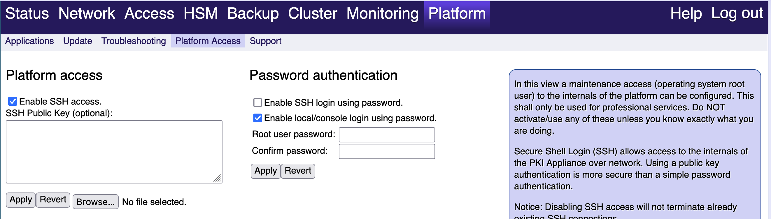 Use the Platform Access tab for configuring an internal maintenance access to the platform.