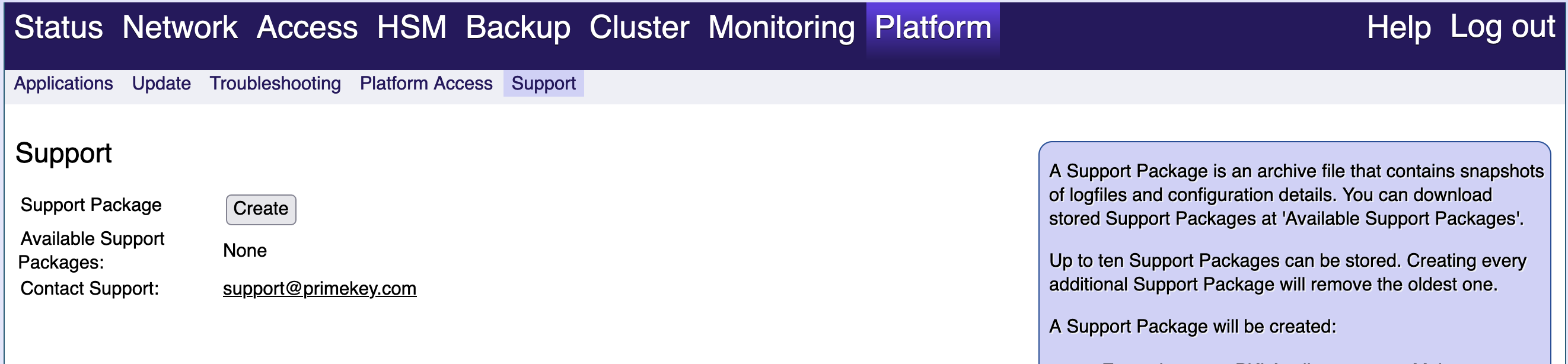 In the Support tab, you have access to existing support packages and you can create new support packages manually. Support packages are archive files with snapshots of log files and configuration details.