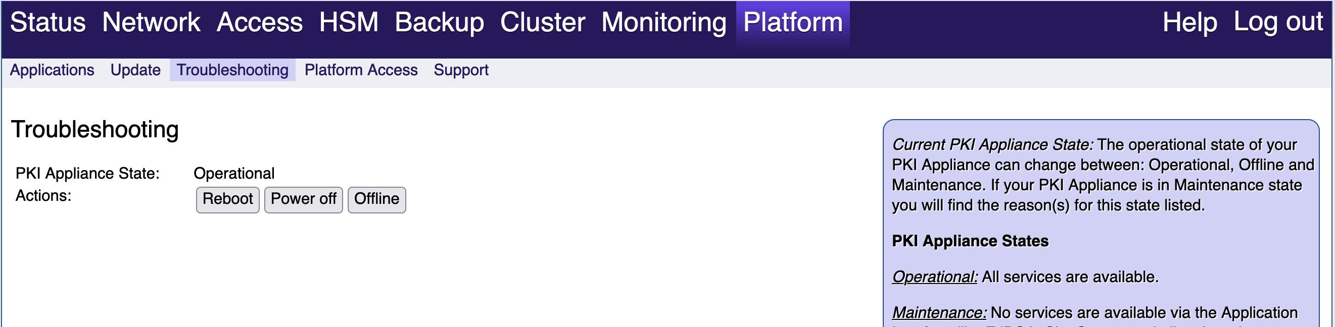 After the update is complete, a message will appear prompting you to reboot the Hardware Appliance. Go to Platform > Troubleshooting and click Reboot.