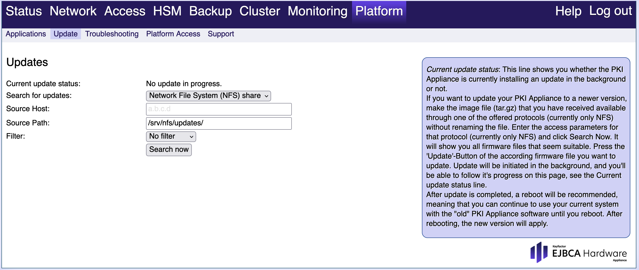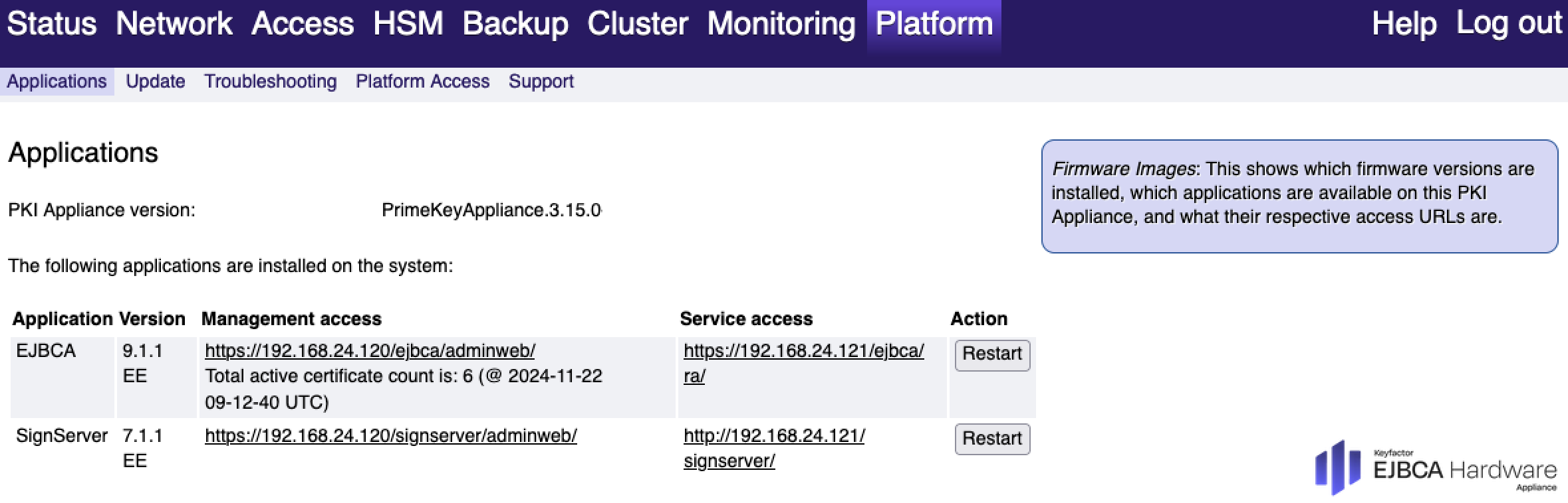 When updating Hardware Appliance firmware and Customer Operating System (COS) applications, like EJBCA or SignServer, they must be updated separately and manually. Start with updating the firmware and then update the application(s).