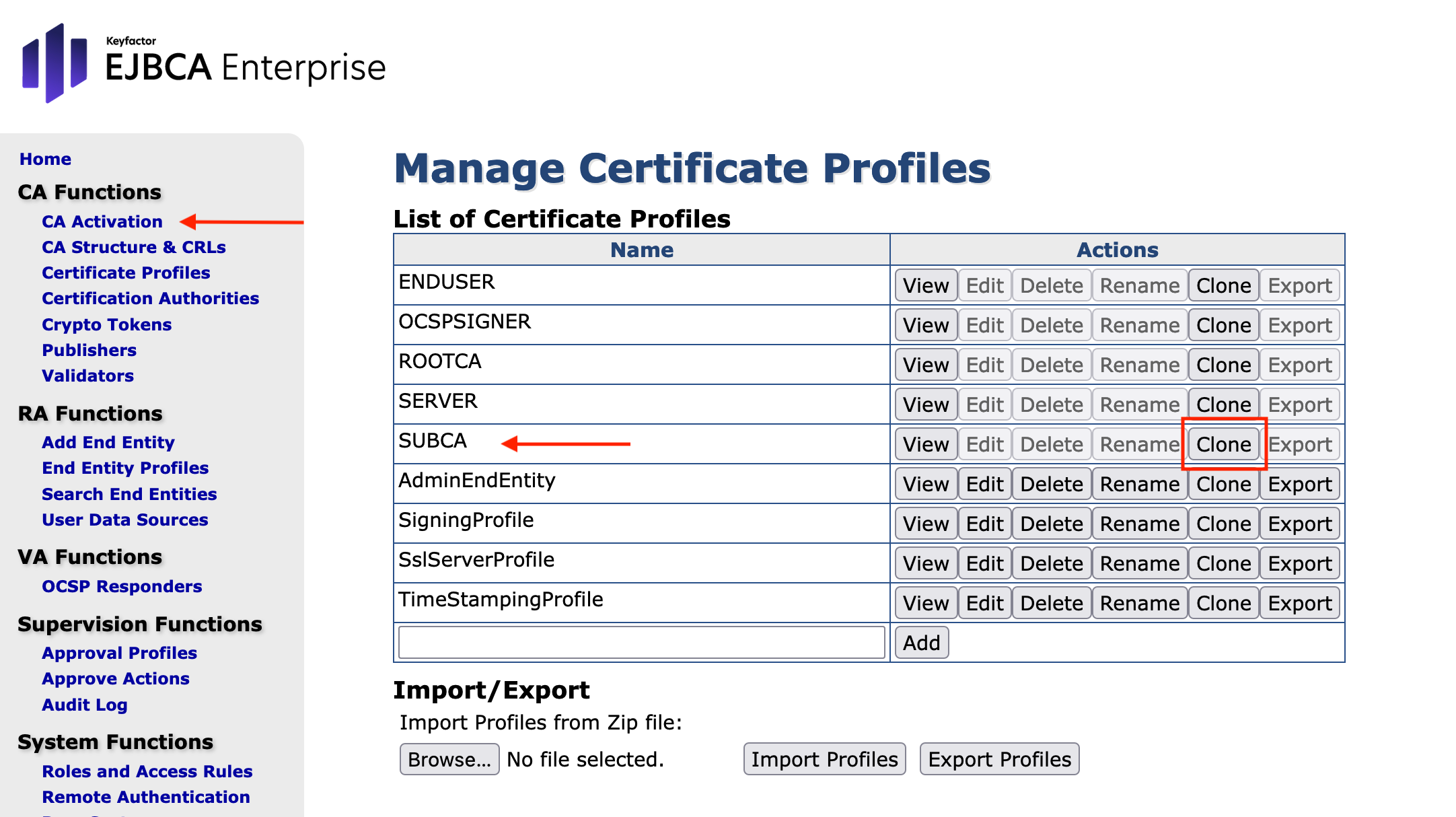For the SUBCA profile click Clone: