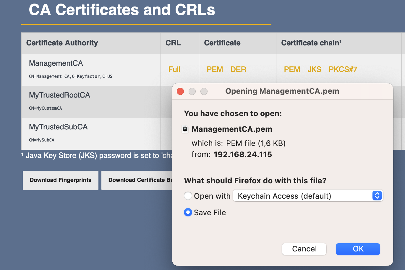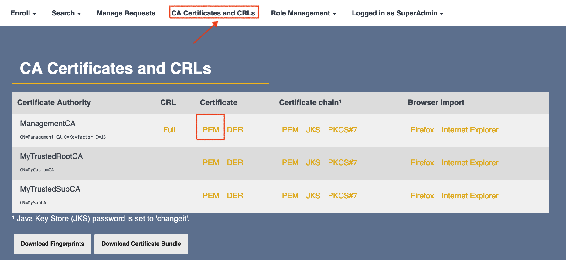- In the row ManagementCA in the CA Certificates and CRLs table, click PEM.