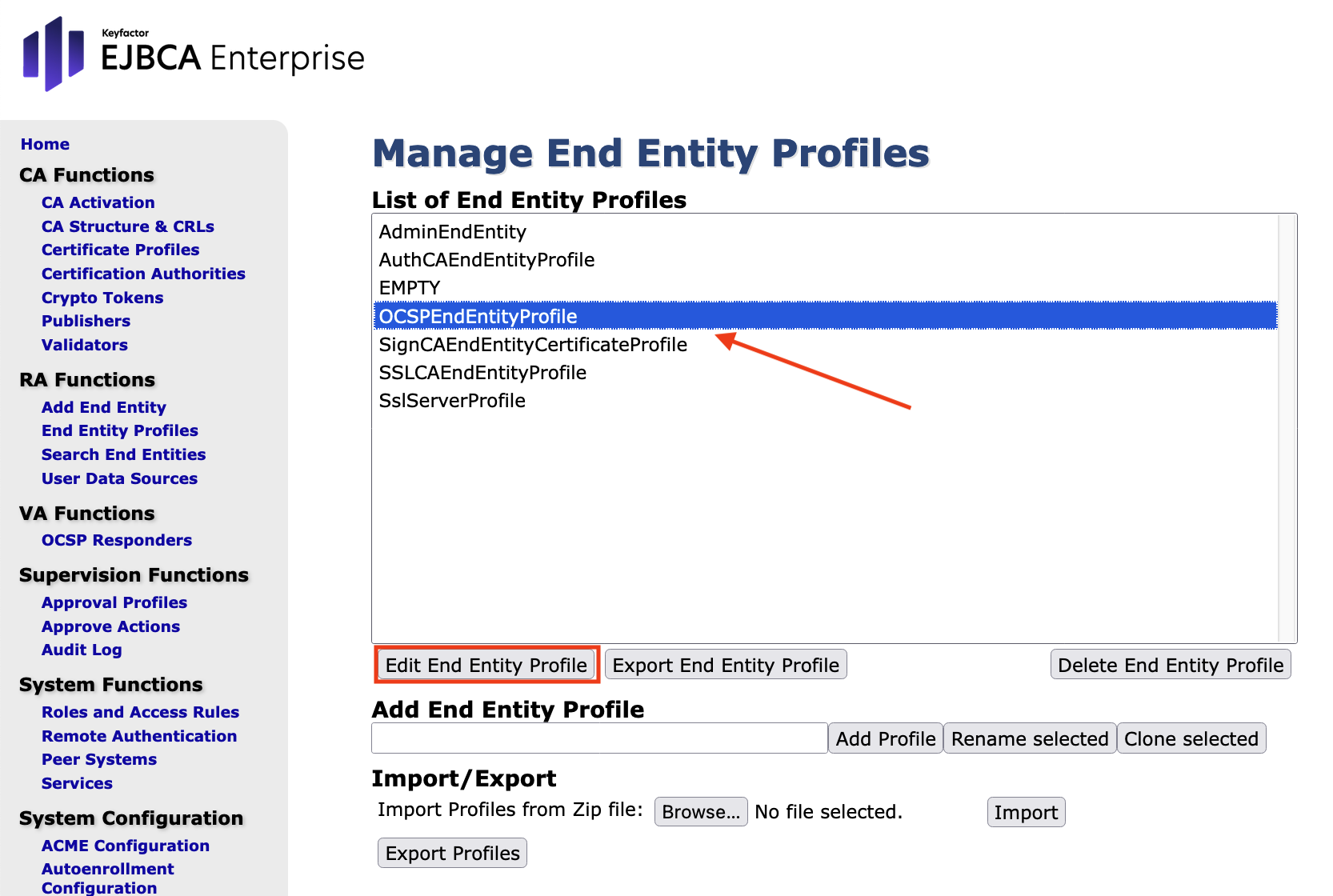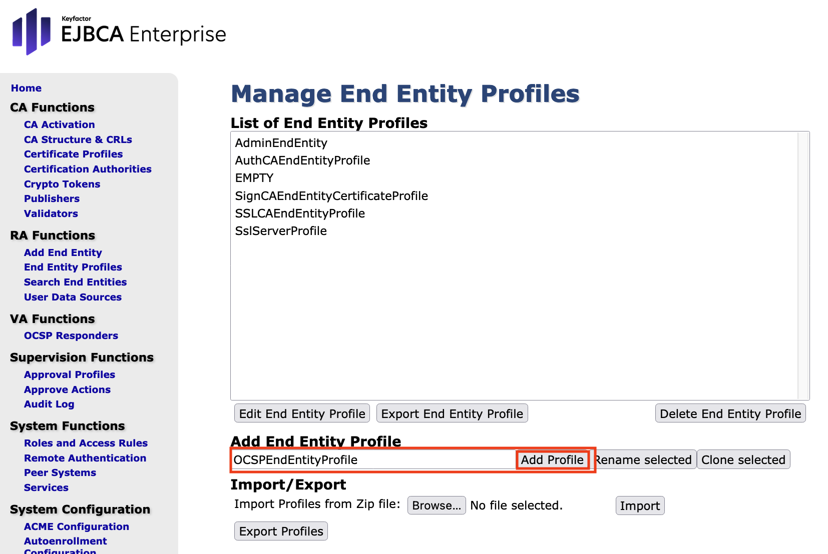 - In Manage End Entity Profiles enter OCSPEndEntityProfile in the Add End Entity Profiles field.
