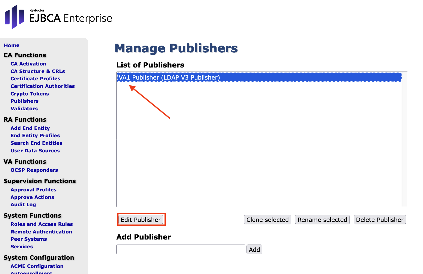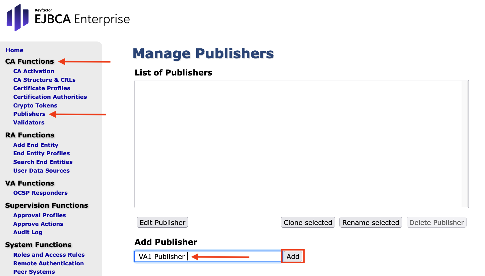 - In the Manage Publishers overview enter VA1 Publisher in the Add Publisher field.