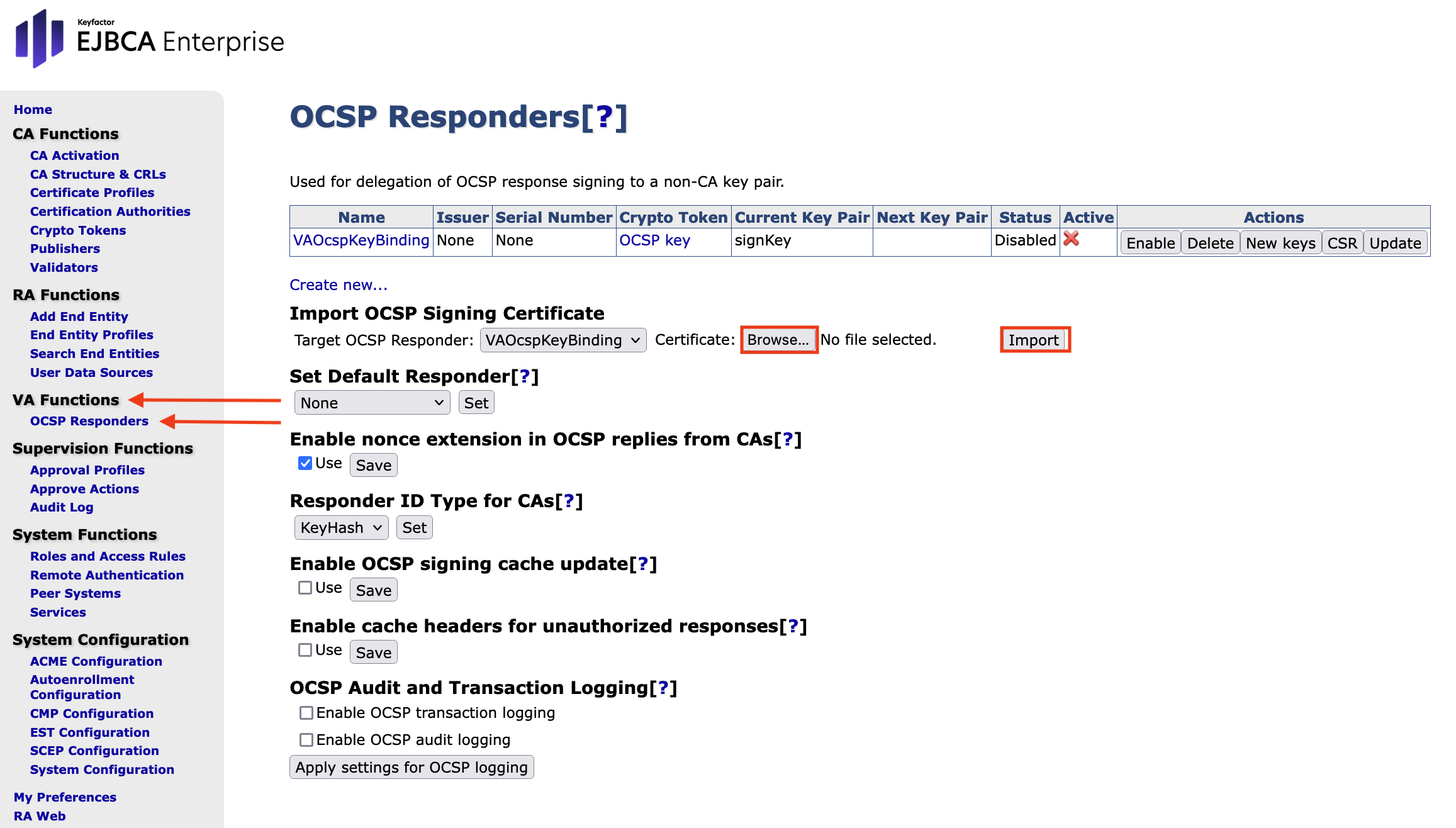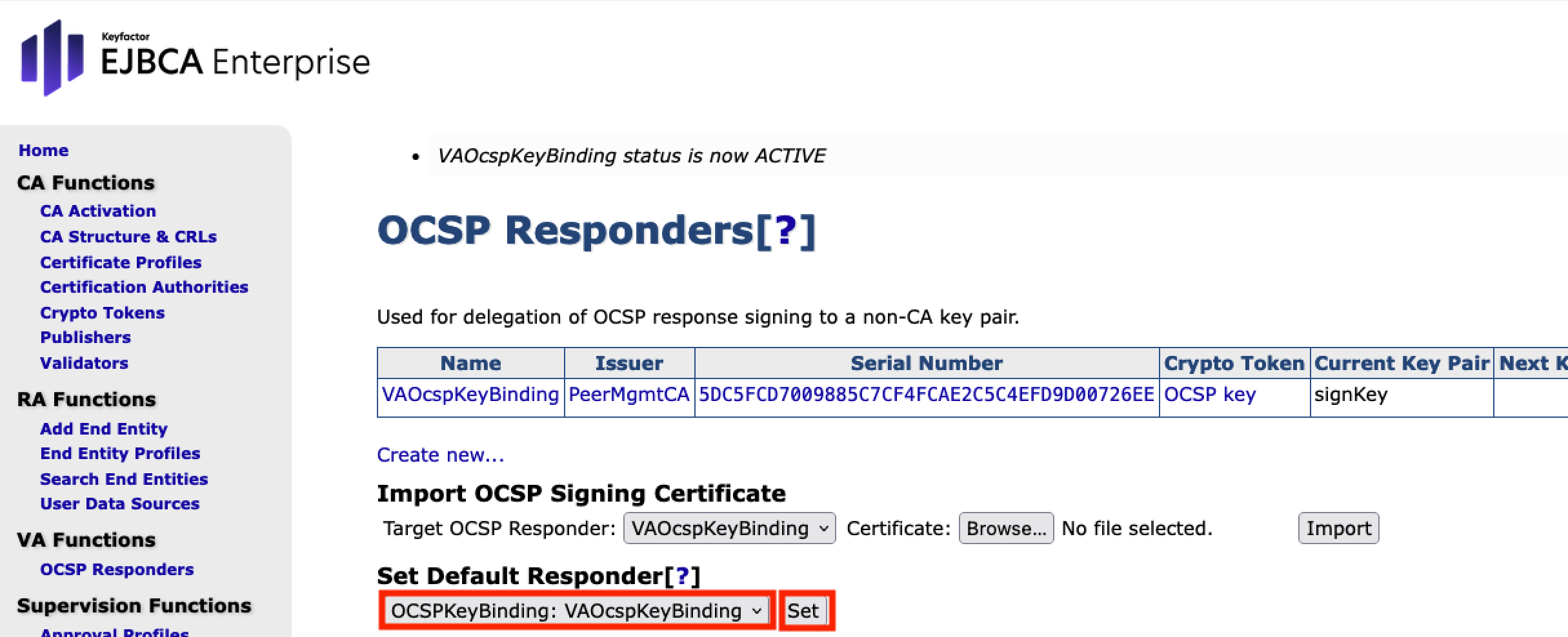 In the section Set Default Responder, select VA OcspKeyBinding from the drop down menu.