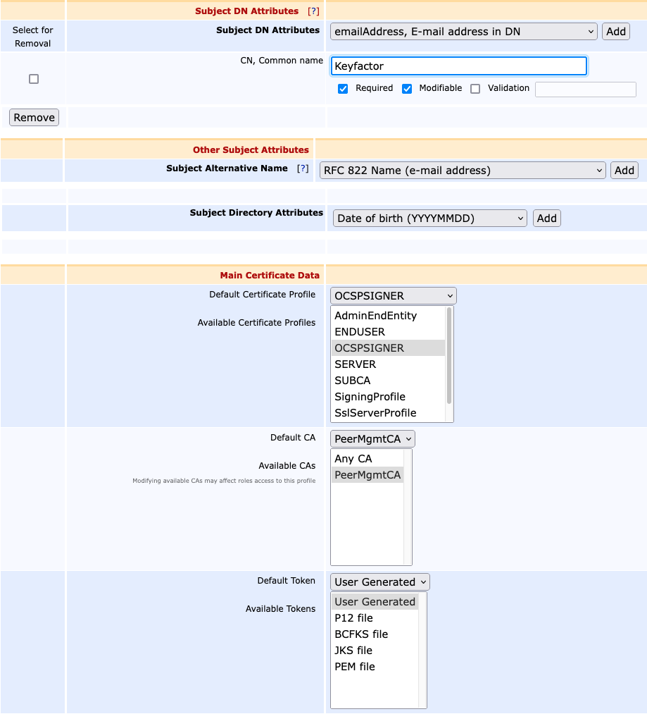 Main Certificate Data - Default Certificate Profile: Select OCSPSIGNER
