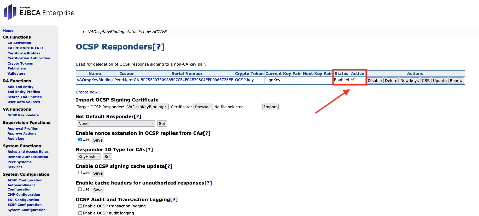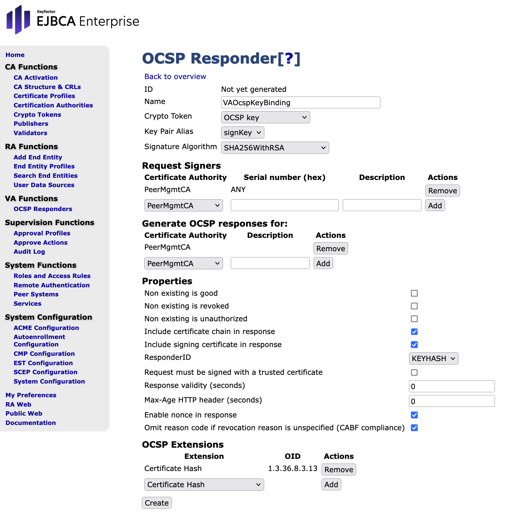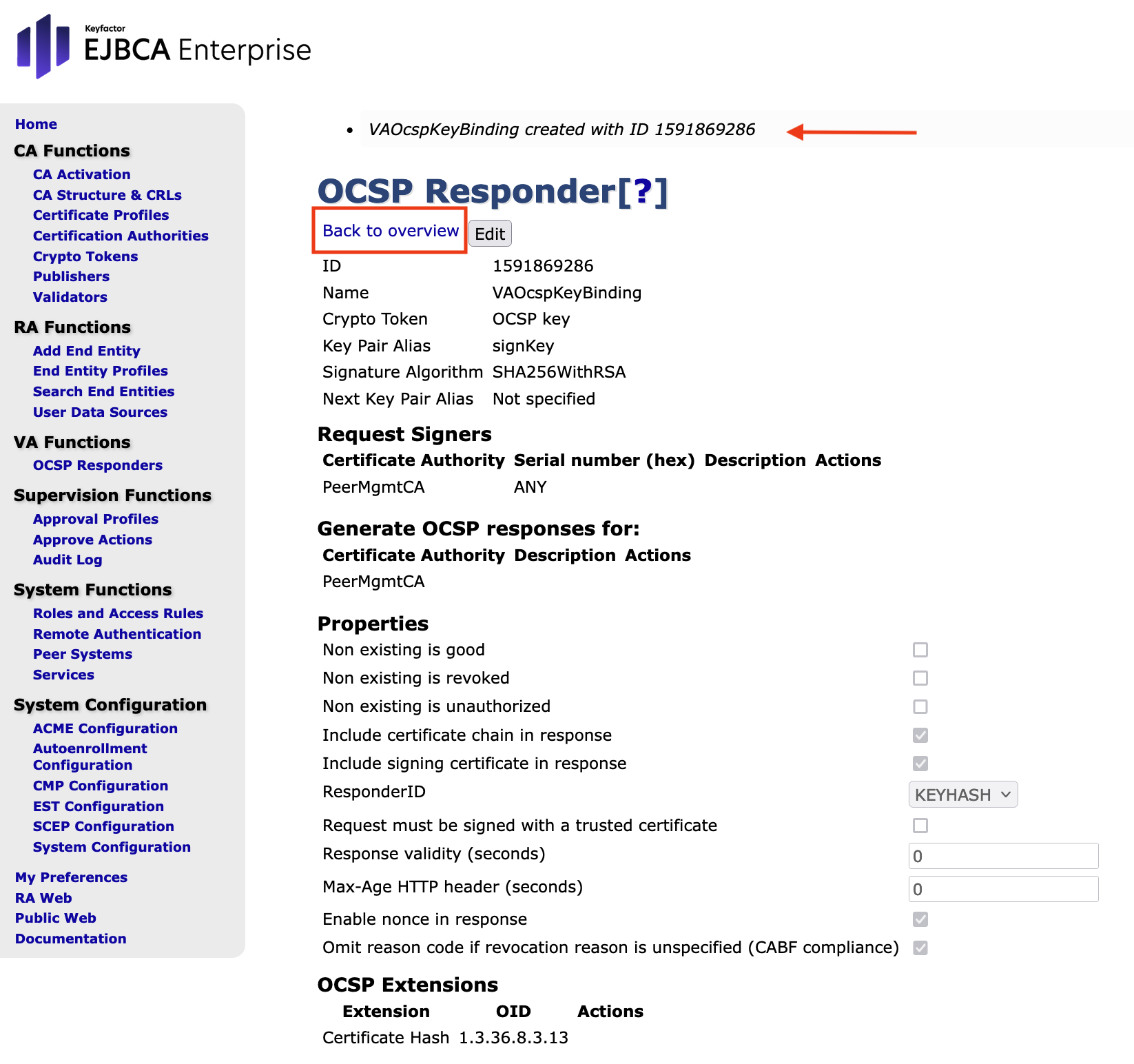 The key binding is created and the following message is displayed: VA OcspKeyBinding created with ID xxxxxxxxxx. (Depending on the database status, this ID could be set to any value.)