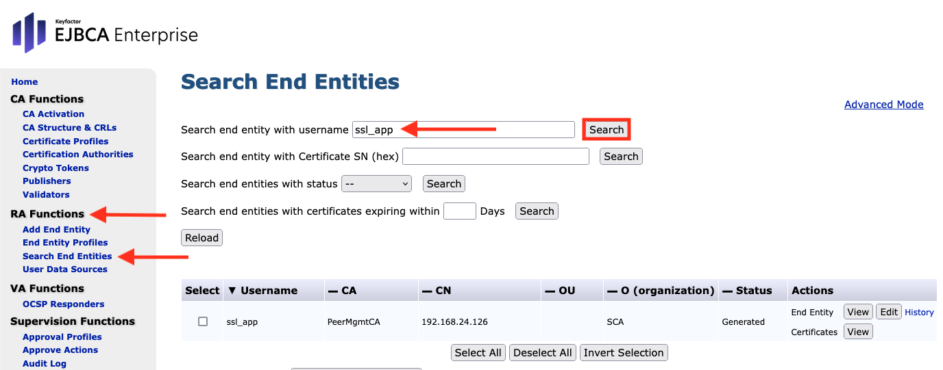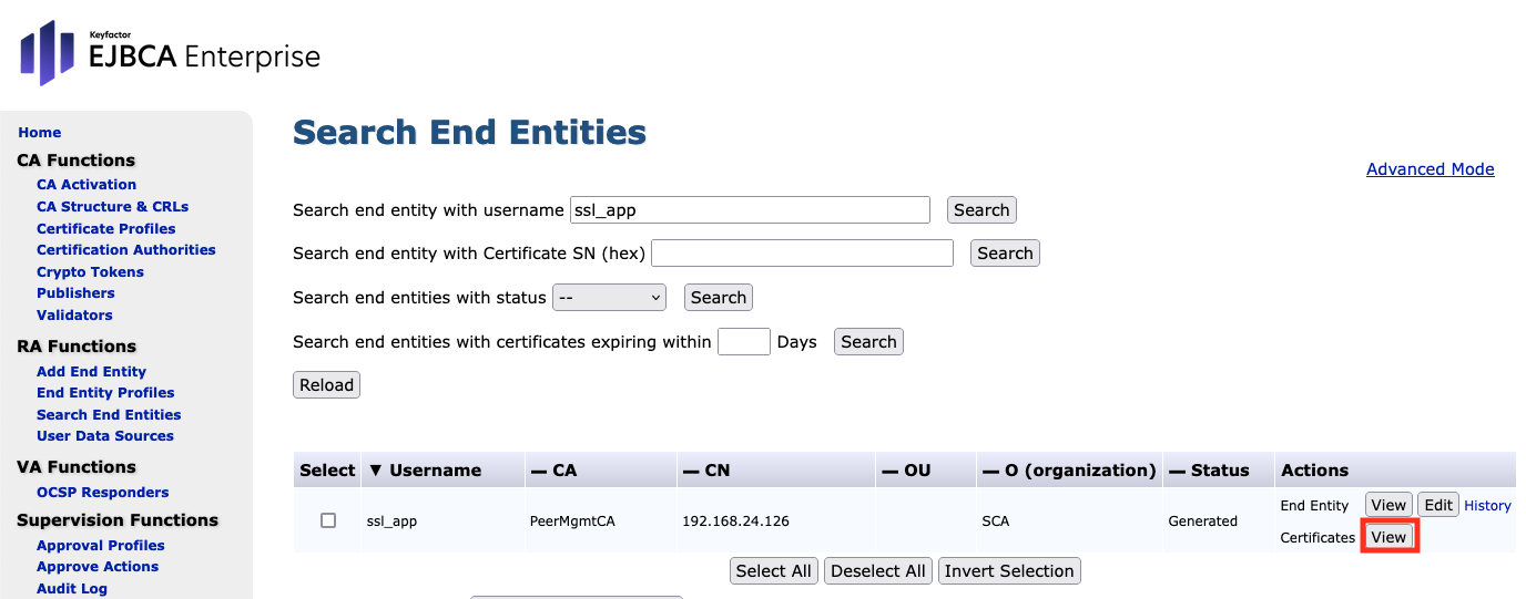 Search End EntitiesThe table in which ssl_app is listed then appears in the lower area. The End Entity can be navigated with the command buttons under the Actions column and with the commands arranged under the table.