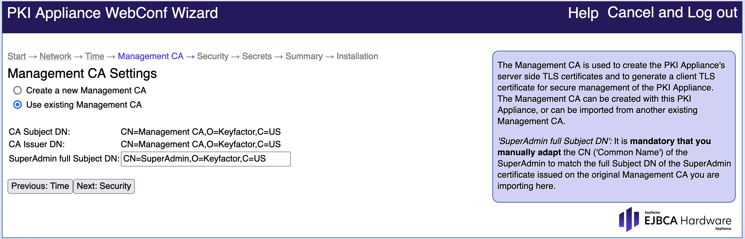 Install the Hardware Appliance as described in the sections of the Initial Set-up until you reach the WebConf installation wizard step Management CA Settings.