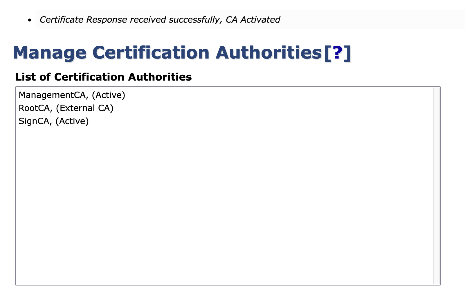 In the section CA Functions > Certification Authorities you will see that SignCA is now active: