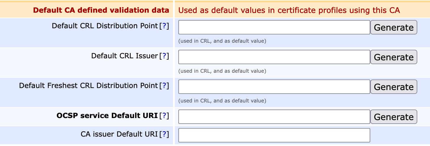 CRL Overlap Time (*d *h *m): Enter the value 2h. The following rows in this section do not need entries.- Section 'Default CA defined validation data'