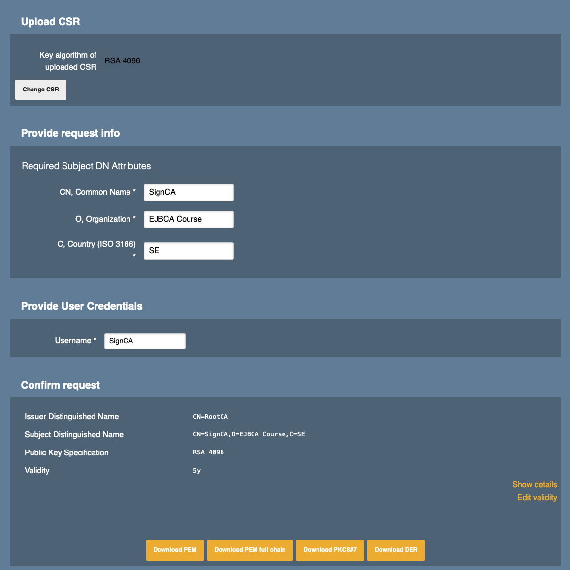 Subject DN: Enter the values CN=SignCA,O=EJBCA Course,C=SE