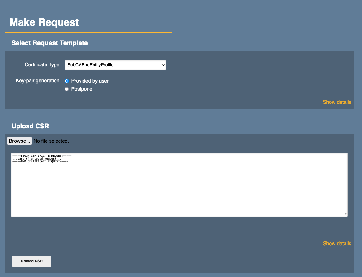 Key-pair generation: ensure Provided by user is activated. - Upload CSR