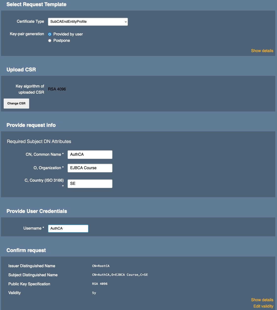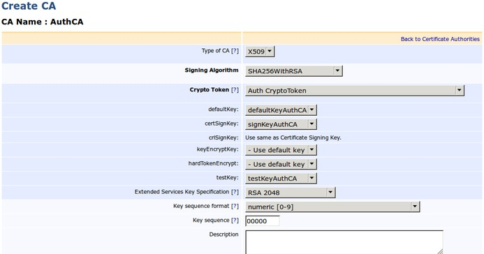 Here we create the second of the SubCAs, namely AuthCA. This CA is installed along with the other SubCAs in the EJBCA Hardware Appliance (Node A) and is signed by RootCA.