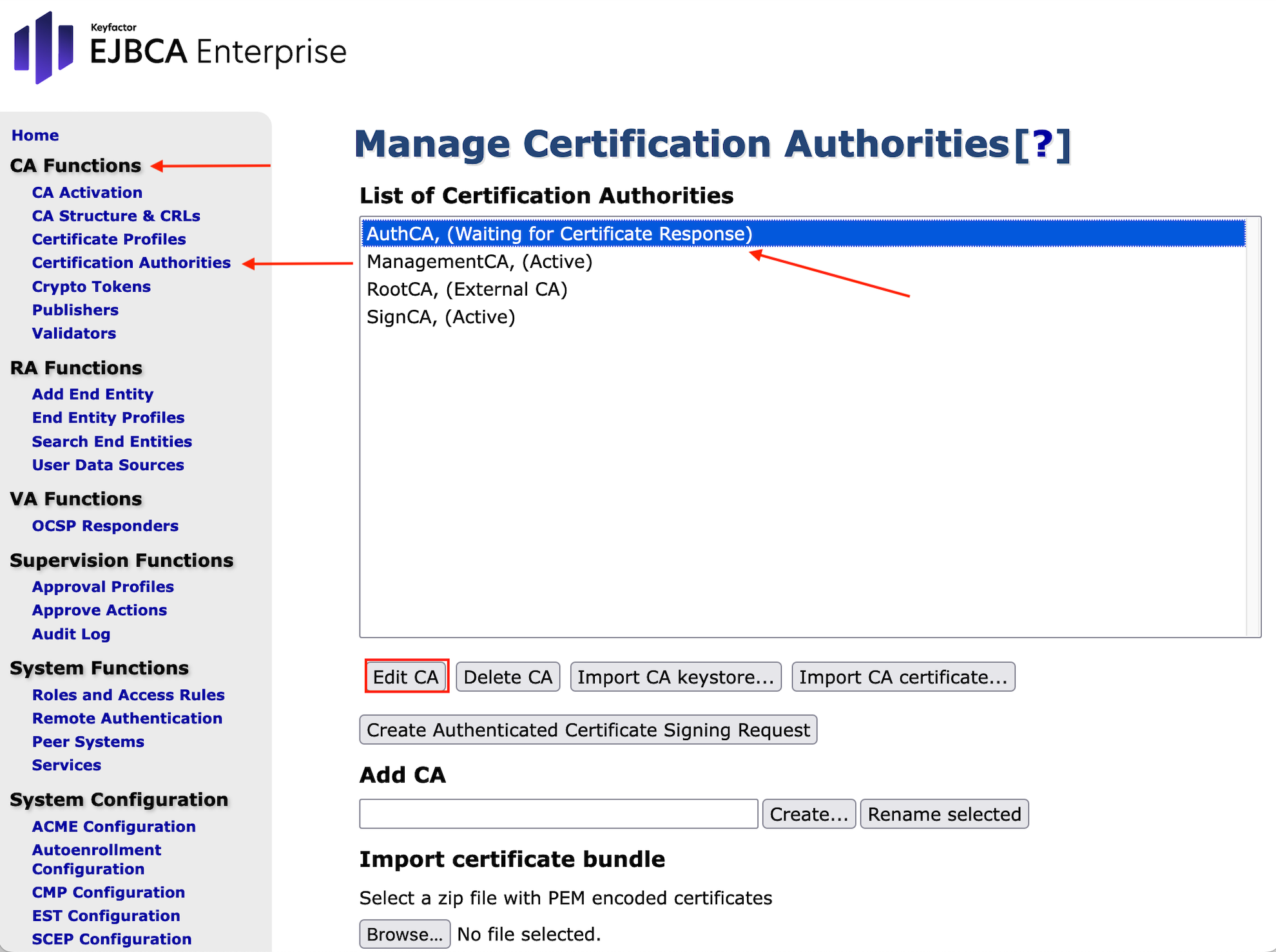 Highlight AuthCA, (Waiting for Certificate) and press Edit CA.