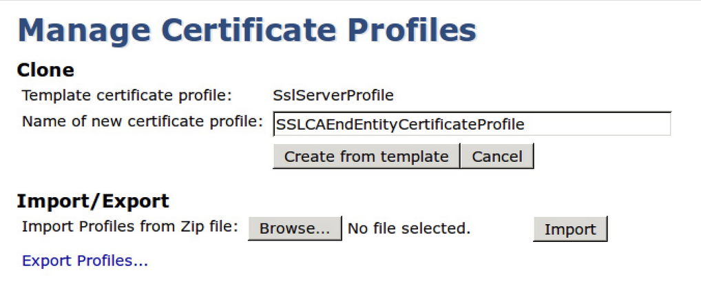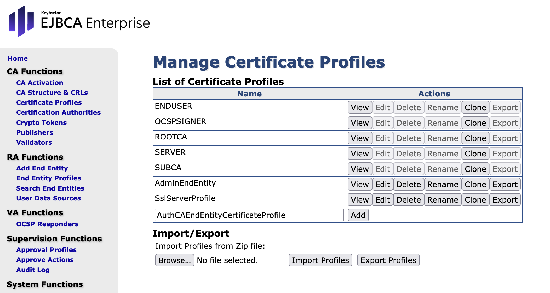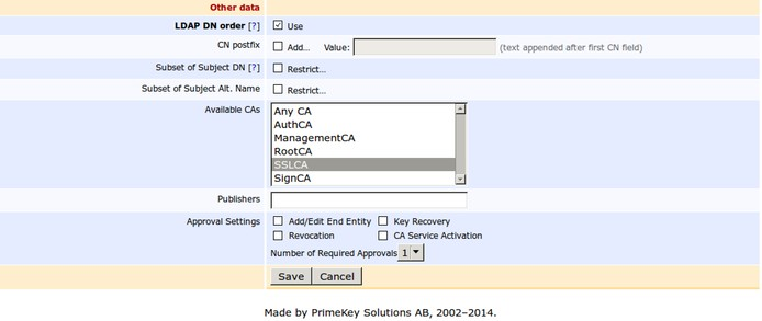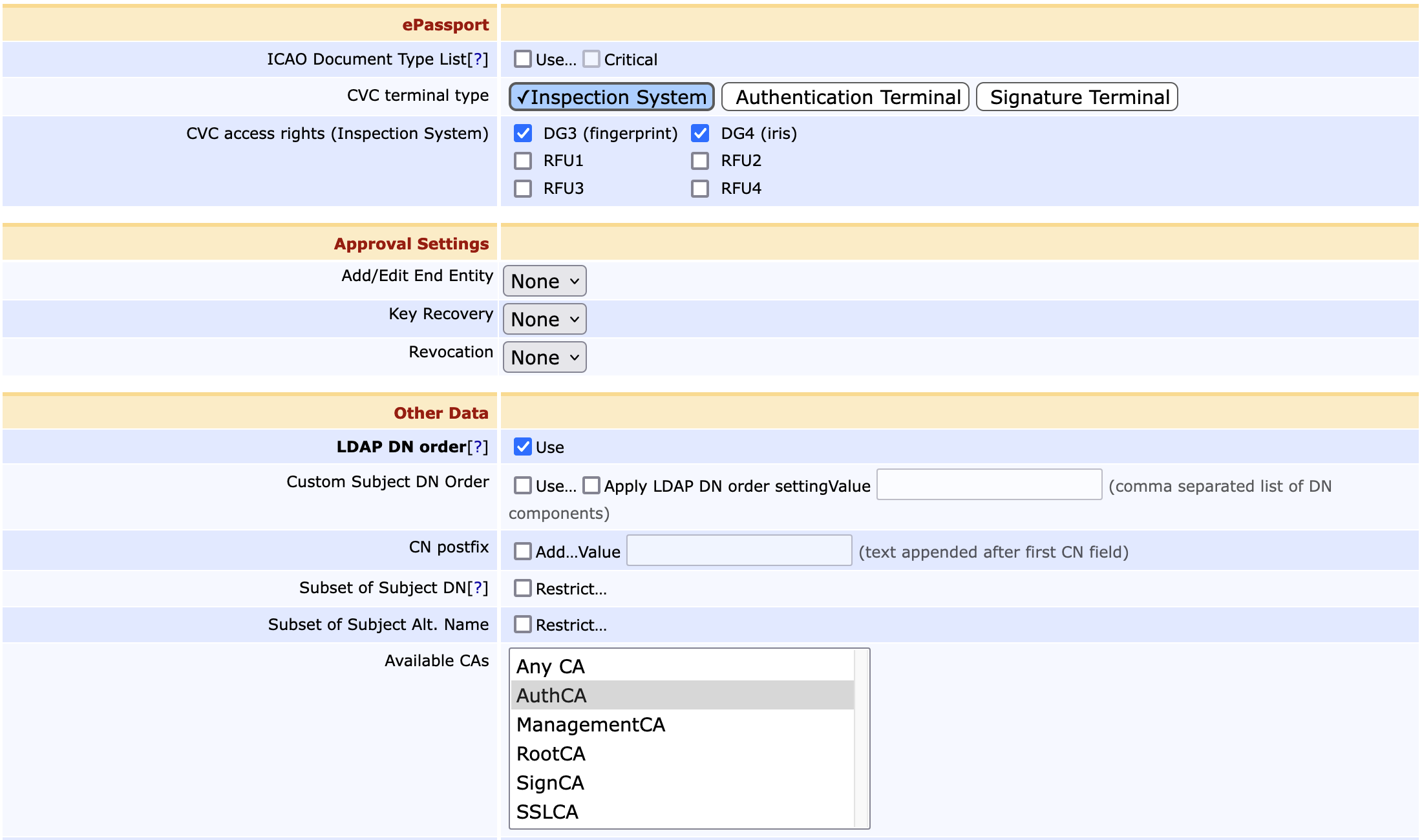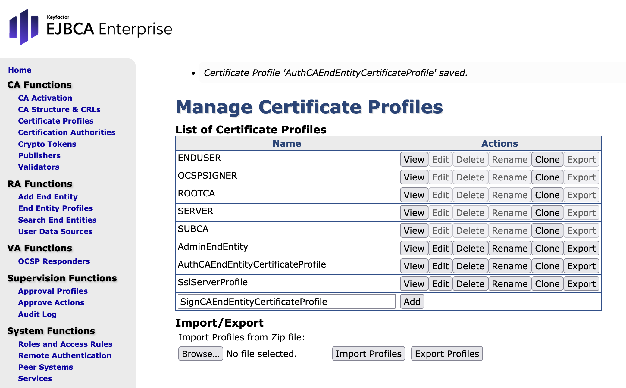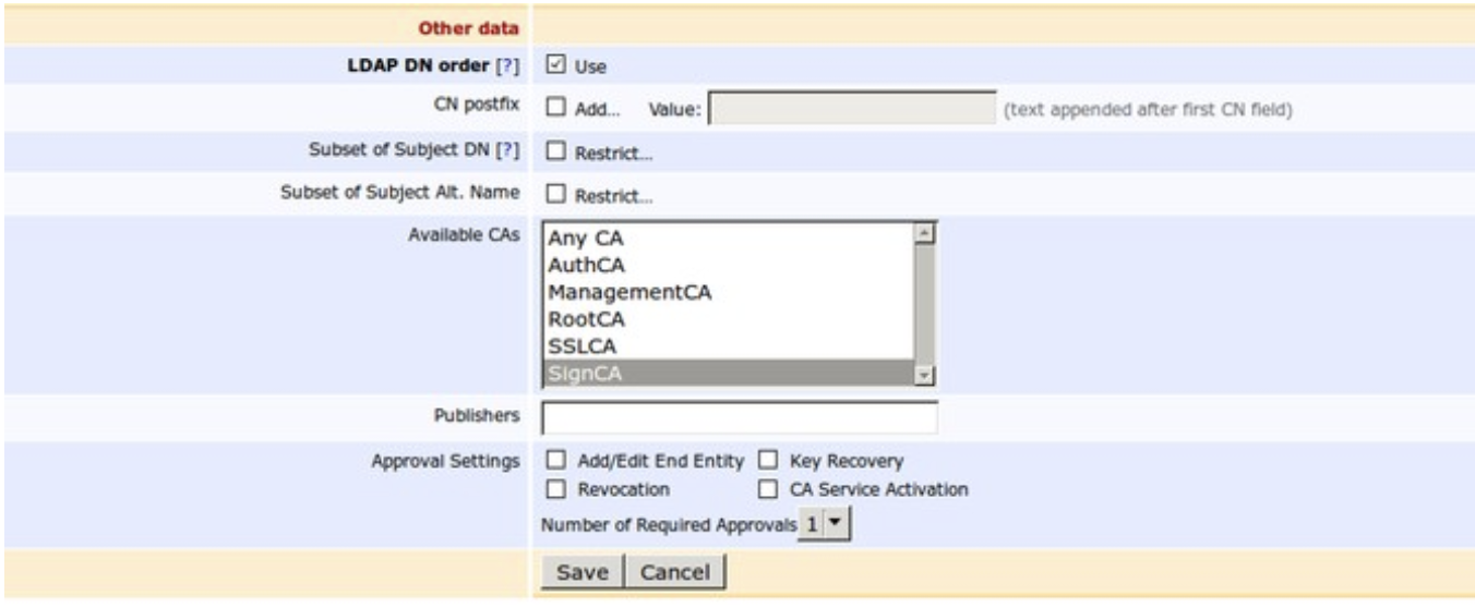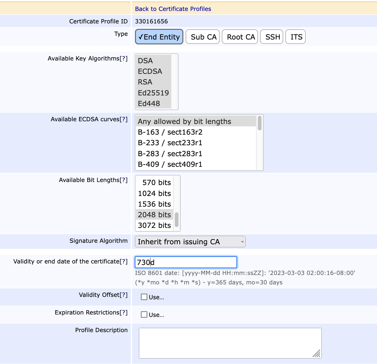 Create Certificate Profiles for the End Entities that will use the SubCAs (SignCA, AuthCA, SSLCA) you created in the previous steps.