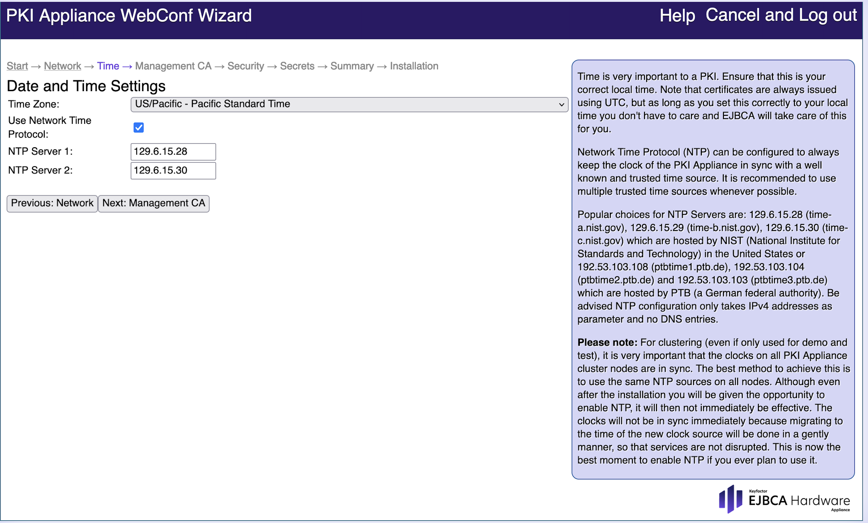 Many Public Key Infrastructure (PKI) applications need a correct date and time. Use a Network Time Protocol (NTP) time source, as this protocol synchronizes the clocks of computers over a network. NTP is for example required to build a cluster.